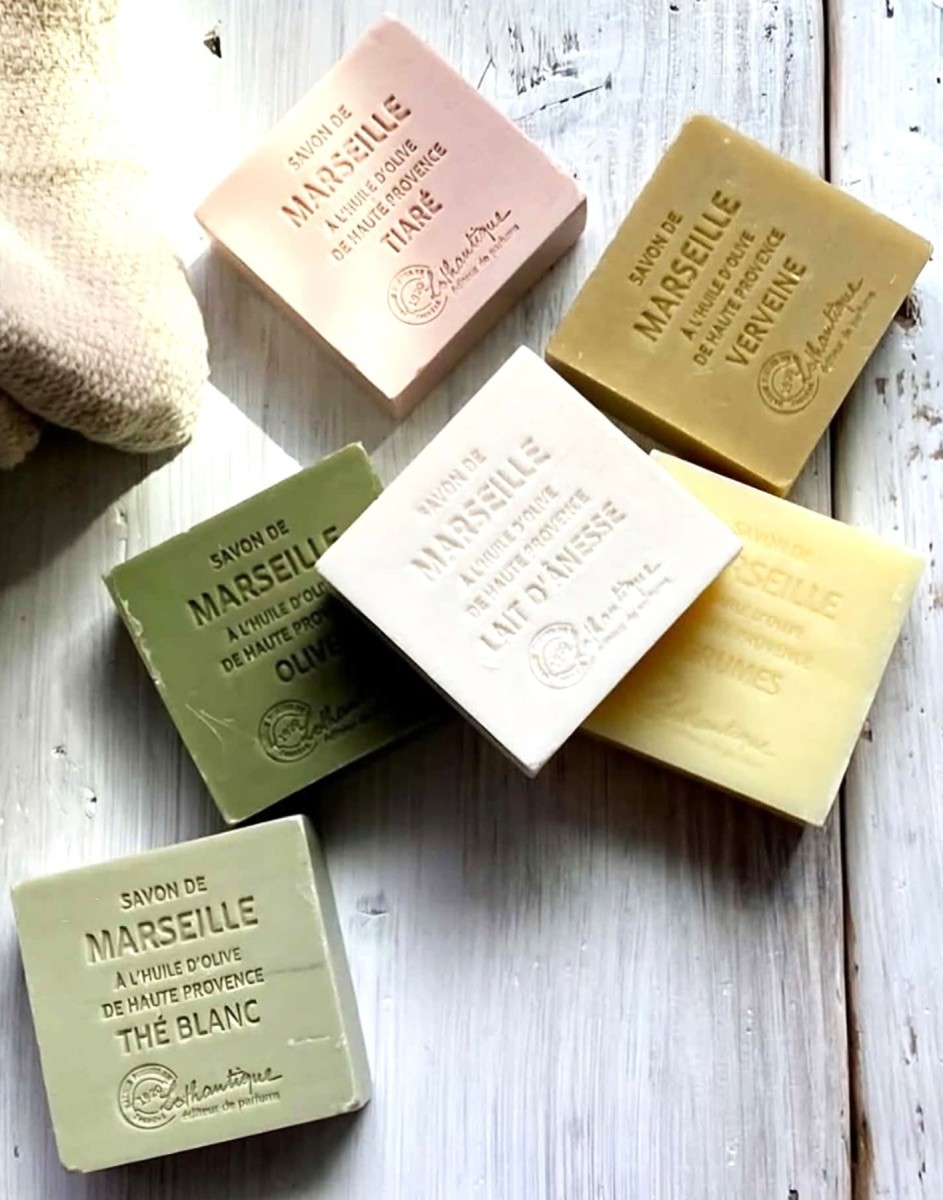 Genuine Marseille soap 100gr wrapped; with olive oil & shea butter fragrances: donkey milk (white), the & verbena (green), olive (green)